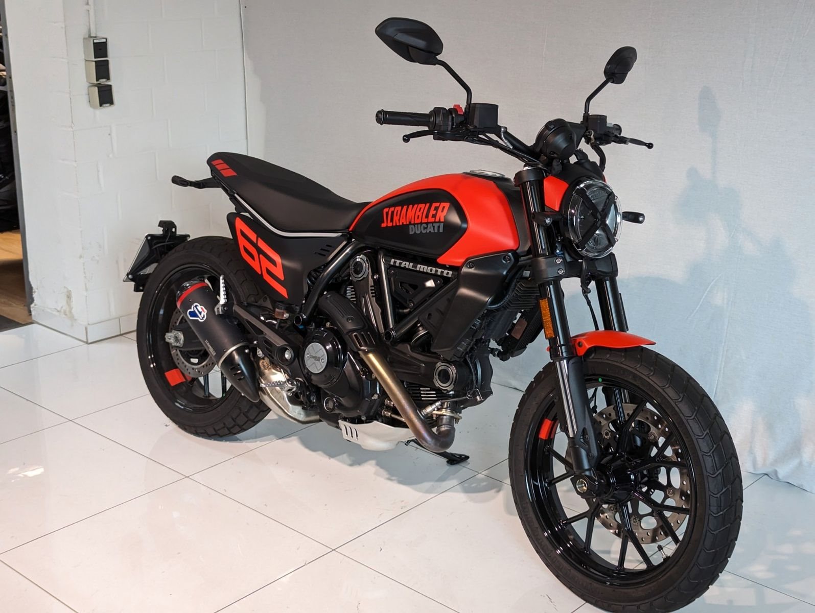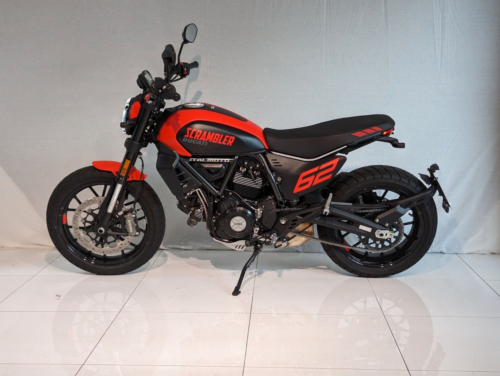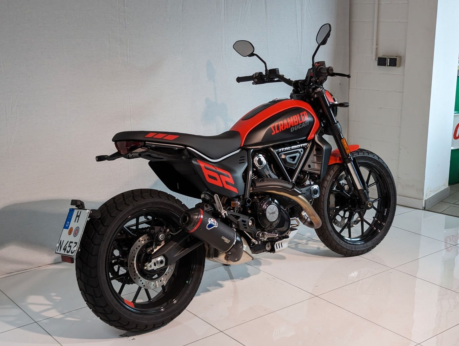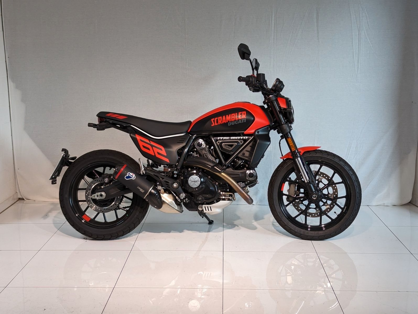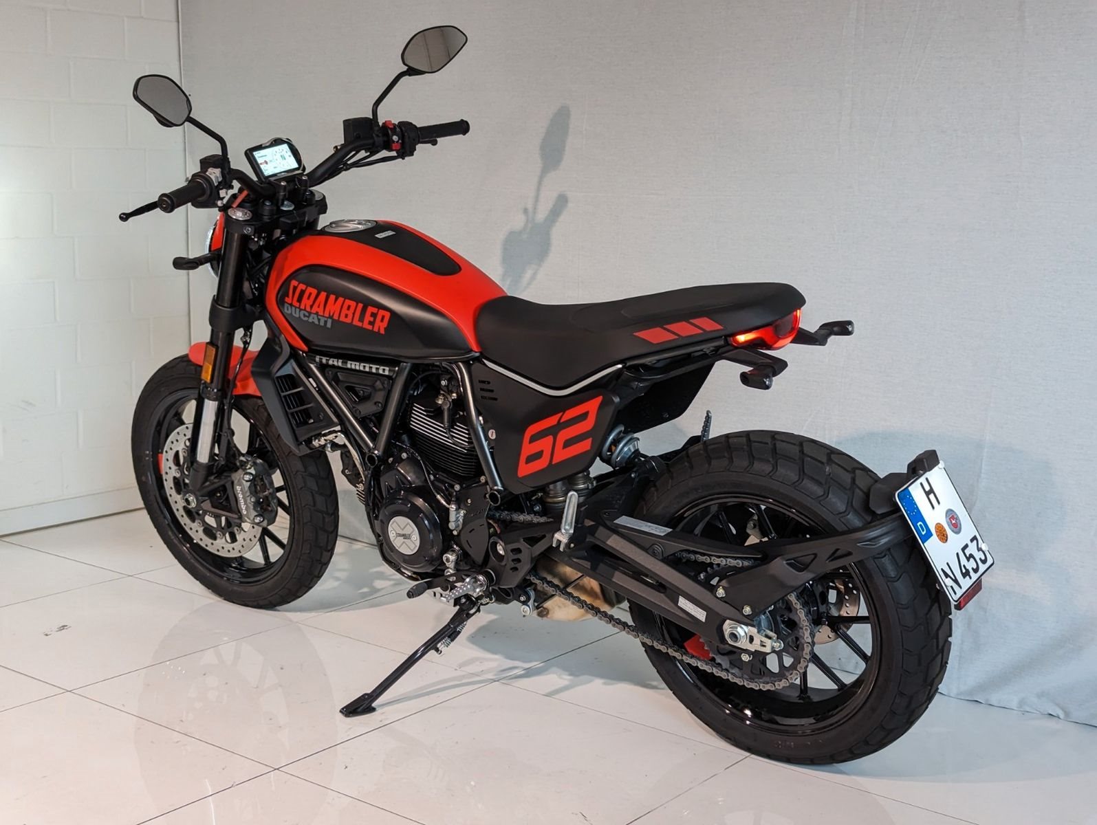 Die sportliche Seite der Next-Gen: Die Full Throttle bezieht ihre Inspiration von den US-Flat-Track-Wettbewerben auf Dirt-Ovalen. Entwickelt, um Grenzen auszuloten und den Alltag hinter sich zu lassen. An den Seiten tragen die Nummerntafeln die Zahl 62, um an das Jahr 1962 zu erinnern, in dem die erste Ducati Scrambler debütierte. Der Ölwannenschutz und der Termignoni Endschalldämpfer komplettieren den Look.