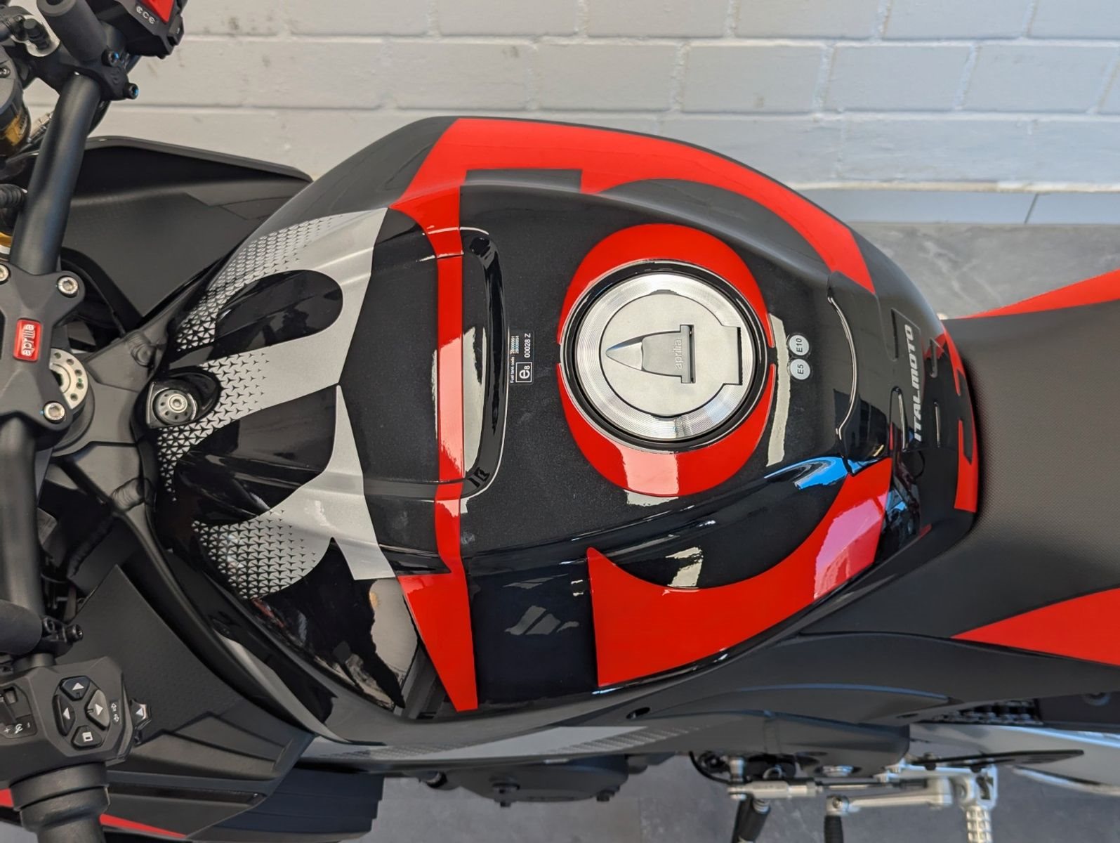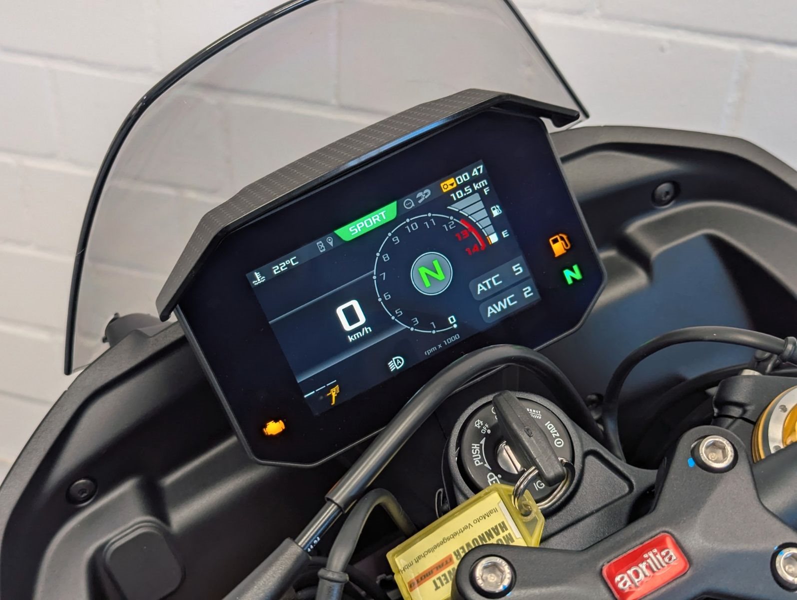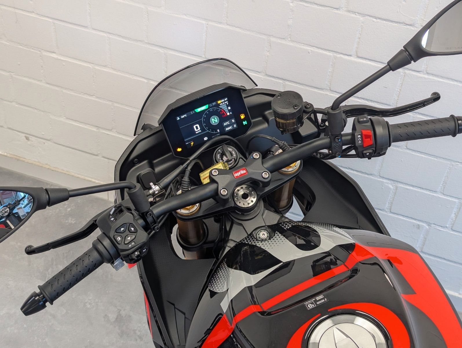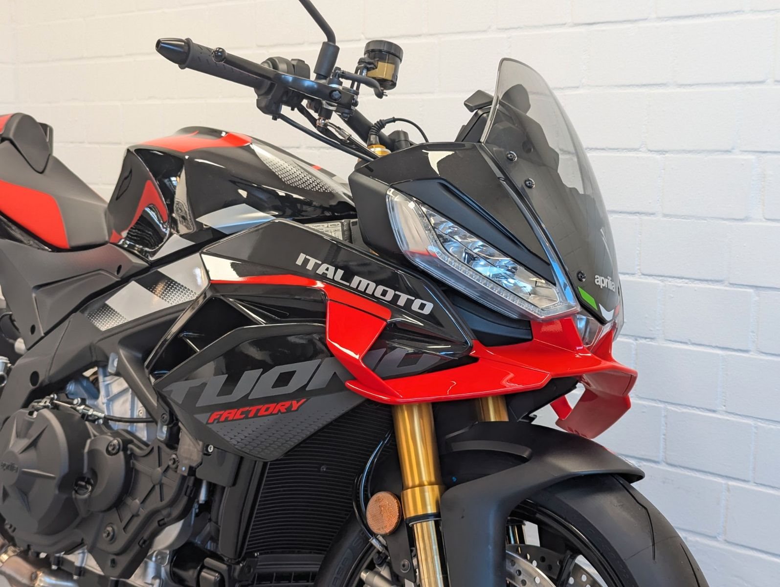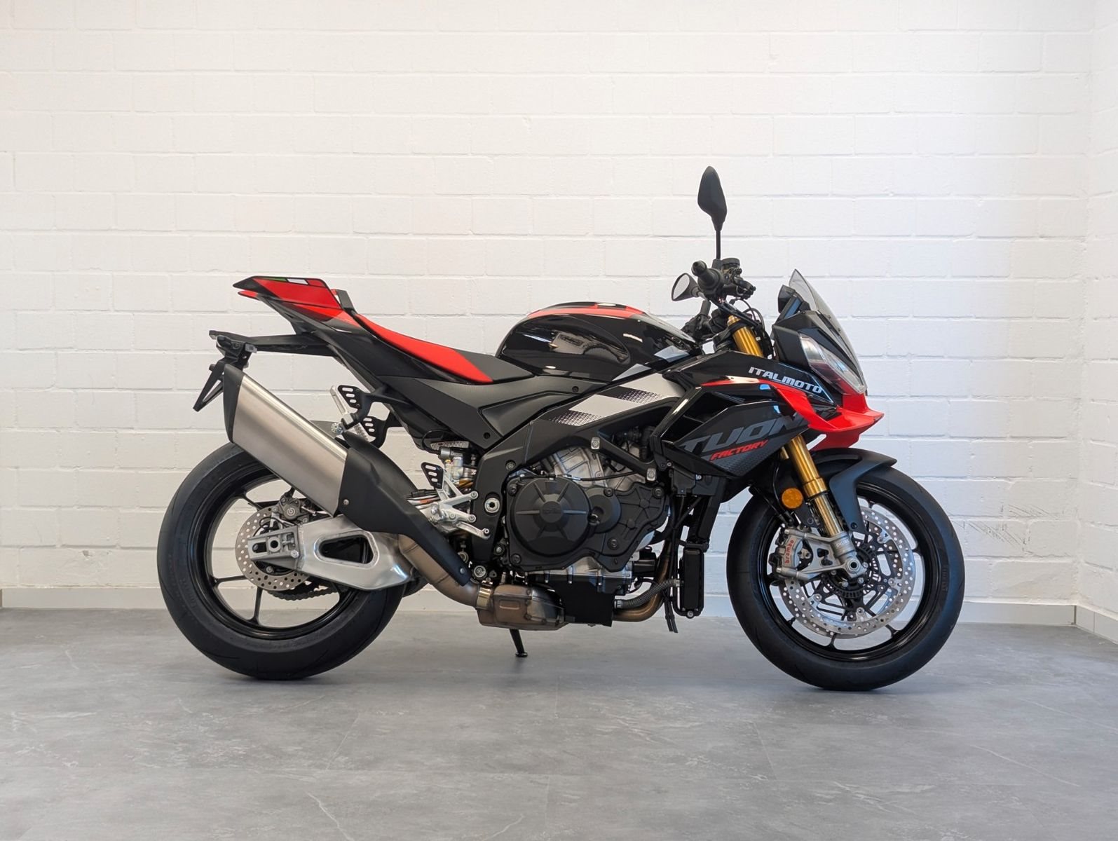 Die Aprilia Tuono V4 Factory präsentiert sich 2025 als ultimatives Naked-Bike mit beeindruckender Leistung und modernster Technologie. Der überarbeitete 65°-V4-Motor wurde von 1077 cm auf 1099 cm vergrößert und erfüllt die Euro 5+ Norm. Er leistet nun 180 PS bei 11.800 U/min und liefert ein maximales Drehmoment von 121 Nm bei 9.600 U/min.