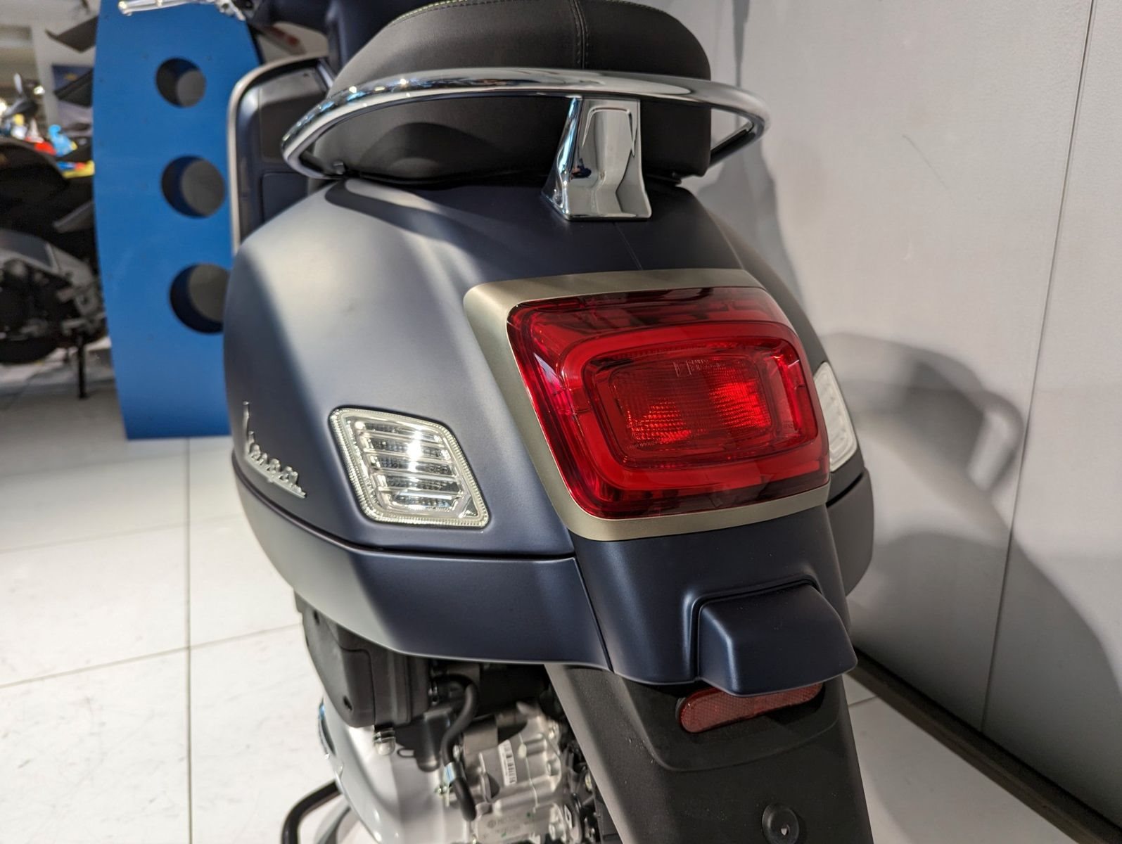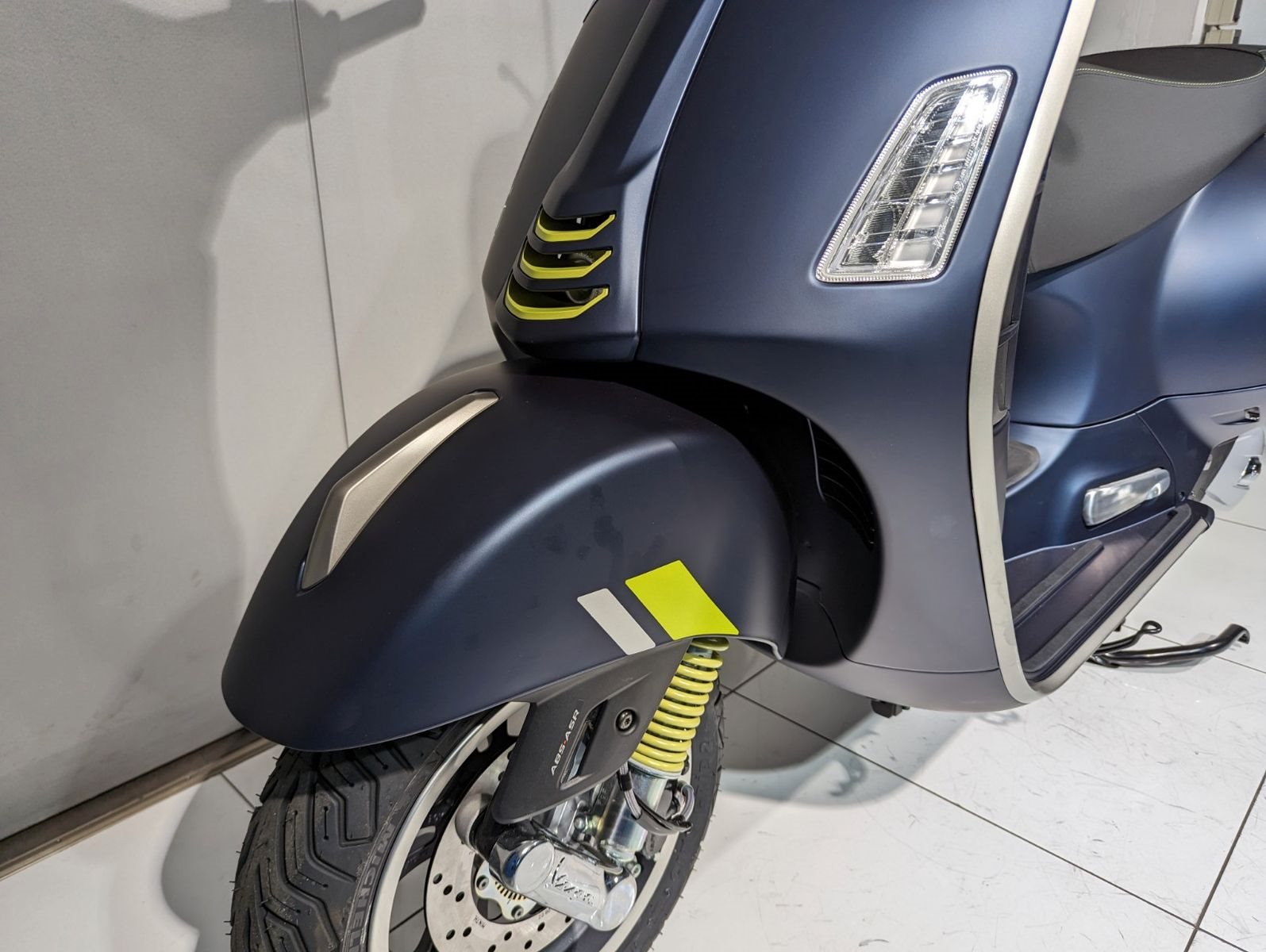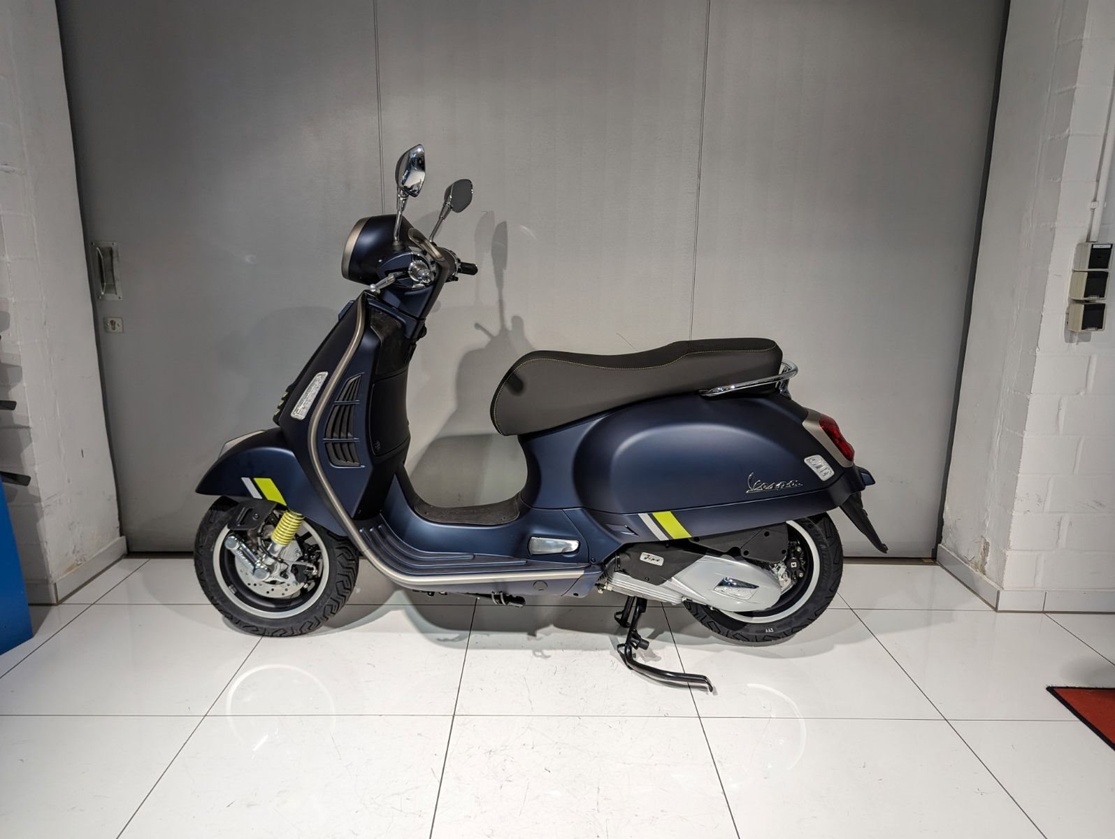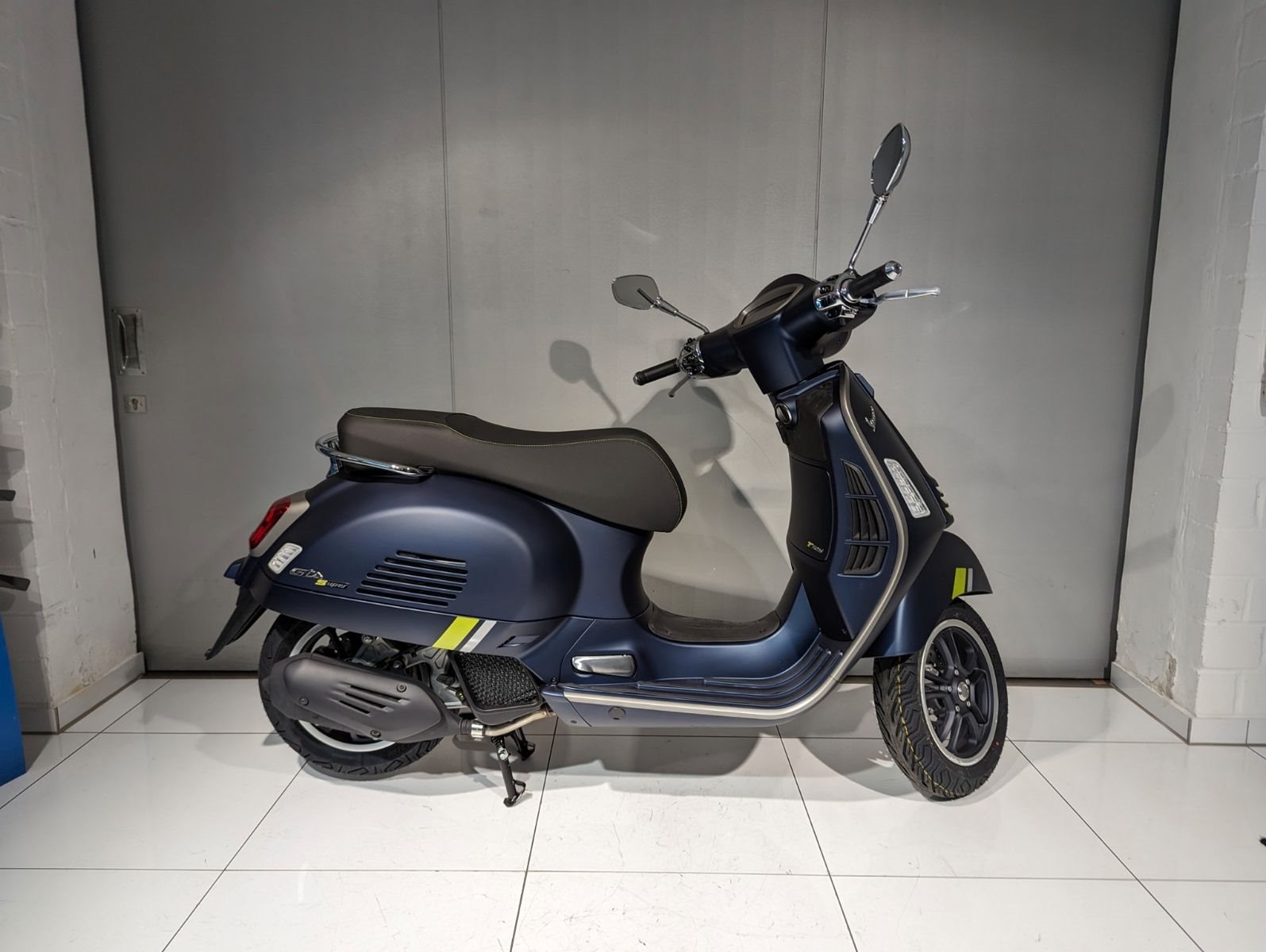 Neueste Technologien treffen auf zeitloses Vespa-Design in einer prächtigen Kombination aus glänzenden, strukturierten und matten Farben, die ein dramatisches Spiel aus Licht und Kontrast erzeugen. Hightech-Lackierungen in warmem Grau und fluoreszierendem Grün ziehen die Blicke auf sich, während Elemente wie der Sitz aus hochwertigen Materialien mit Kontrastnähten, das Untersitzfach mit LED-Beleuchtung und das ansprechende Design der vielen anderen Details nur einige der Gründe sind, warum Vespa-Roller weiterhin eine einzigartige Spezies bleiben.